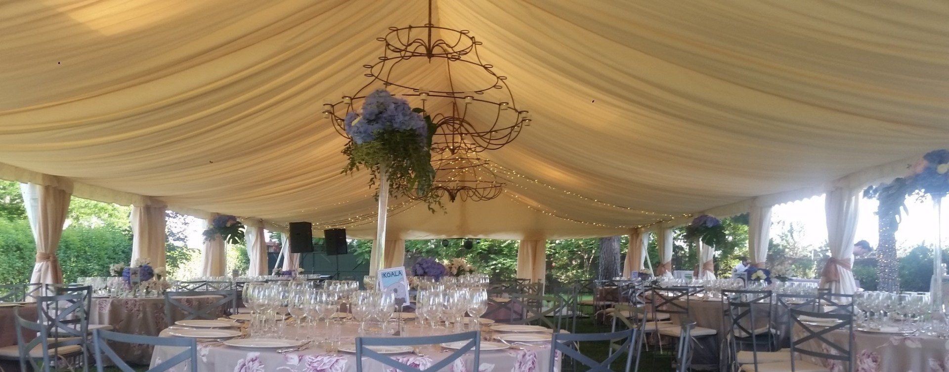 La calidad de nuestros tejidos se ve en la decoración interior de la carpa y junto a nuestros diversos acabados a través de falsos techos fruncidos tanto en beige como en blanco roto consiguen un ambiente acogedor y elegante.