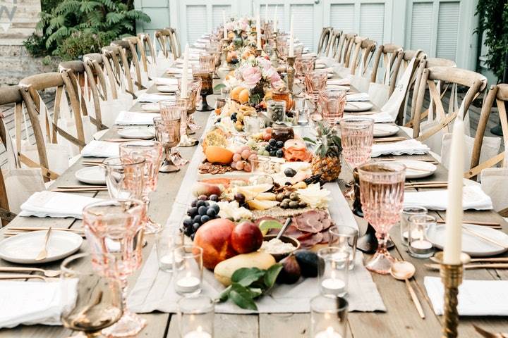 Las mesas largas infinitas se han vuelto muy populares gracias a las bodas íntimas. Los mejores centros serán caminos largos de follaje con acentos florales; en cuanto a la tendencia en sillas éste año la elegida será la de madera natural estilo vintage con ratán, aportan esa calidez que necesitamos y mimetiza muy bien con el entorno.